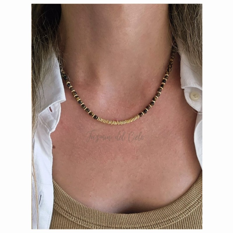 Collar en piedras naturales de Ojo de tigre con separadores en forma de margaritas en acero inoxidable.