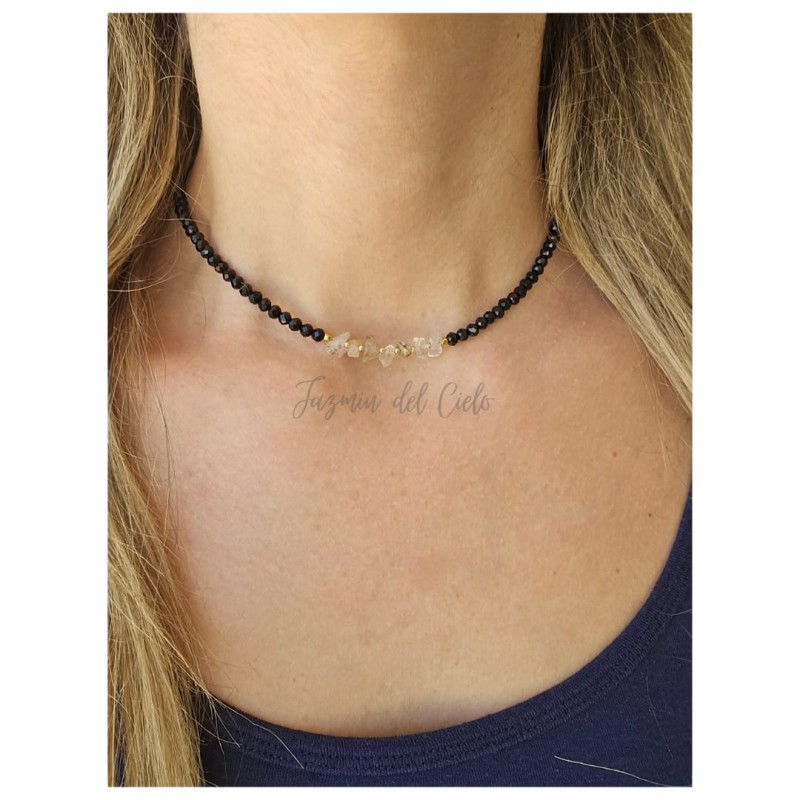 Collar en cristales facetados negros con piedras naturales en Fluorita amarilla en medio con separadores dorados en acero inoxidable.