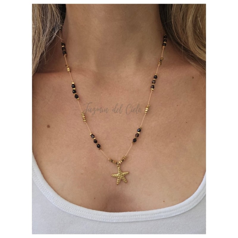 Collar en hilo atado con piedras naturales de Calcedonia negra con hematita dorado. Con un dije central en forma de estrella de mar dorado en acero inoxidable.