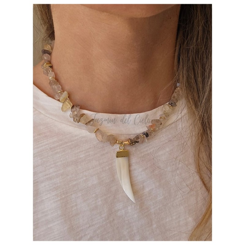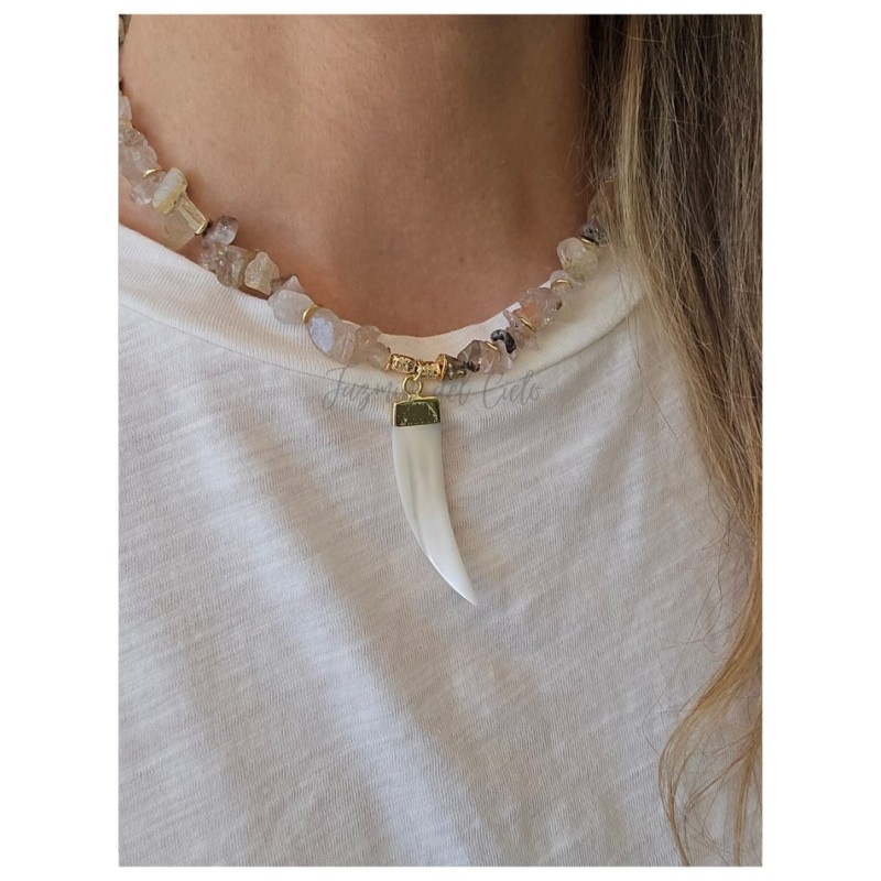 Collar en piedras naturales irregulares de Fluorita amarilla con separadores dorados Goldfield y un dije central en forma de diente en nacar