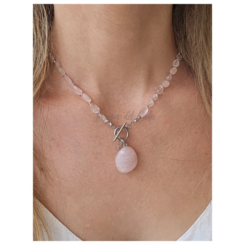 Collar en piedras naturales irregulares de Cuarzo Rosa con cierre OT y separadores en acero inoxidable con un dije en piedra de Cuarzo Rosa.