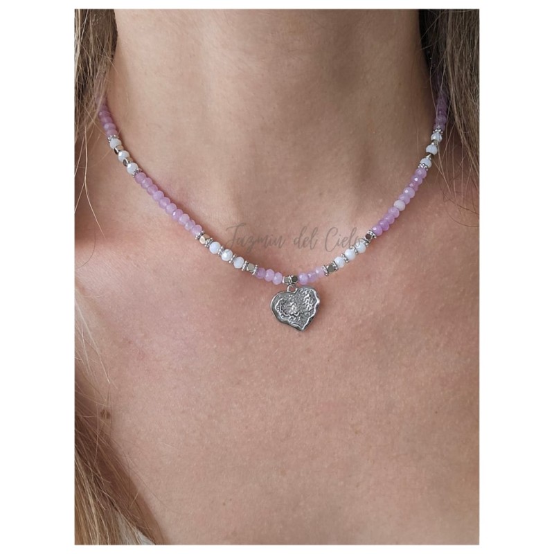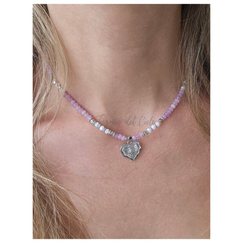 Collar en cuentas de piedras naturales Rondelle planas de Calcedonia de combinadas con piedra lunar facetadas y separadores en acero inoxidable con un dije central en forma de corazón en acero inoxidable