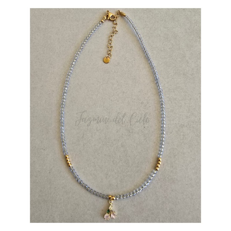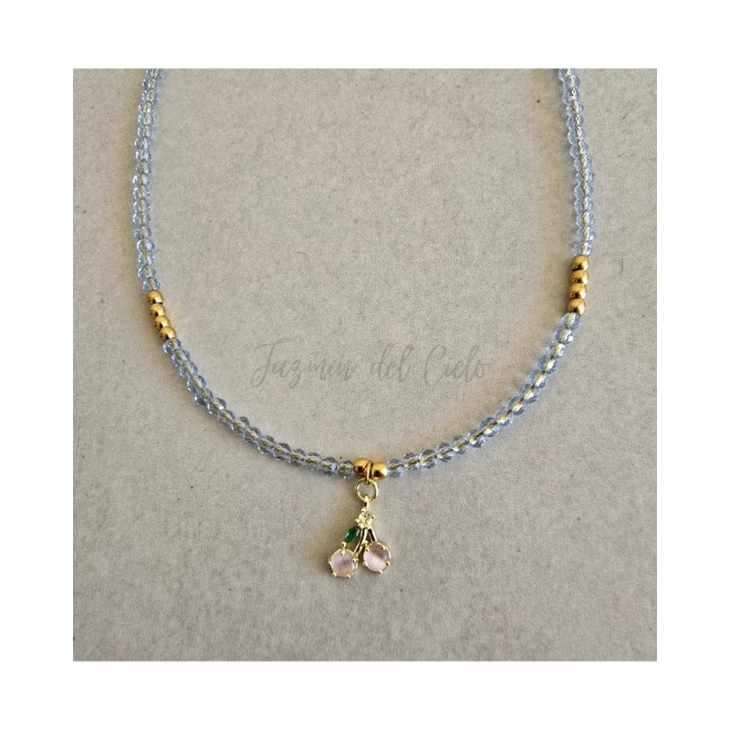 Collar de mini cristales color celeste pálido con separadores en acero inoxidable y un mini dije central de circón en forma de guinda.
