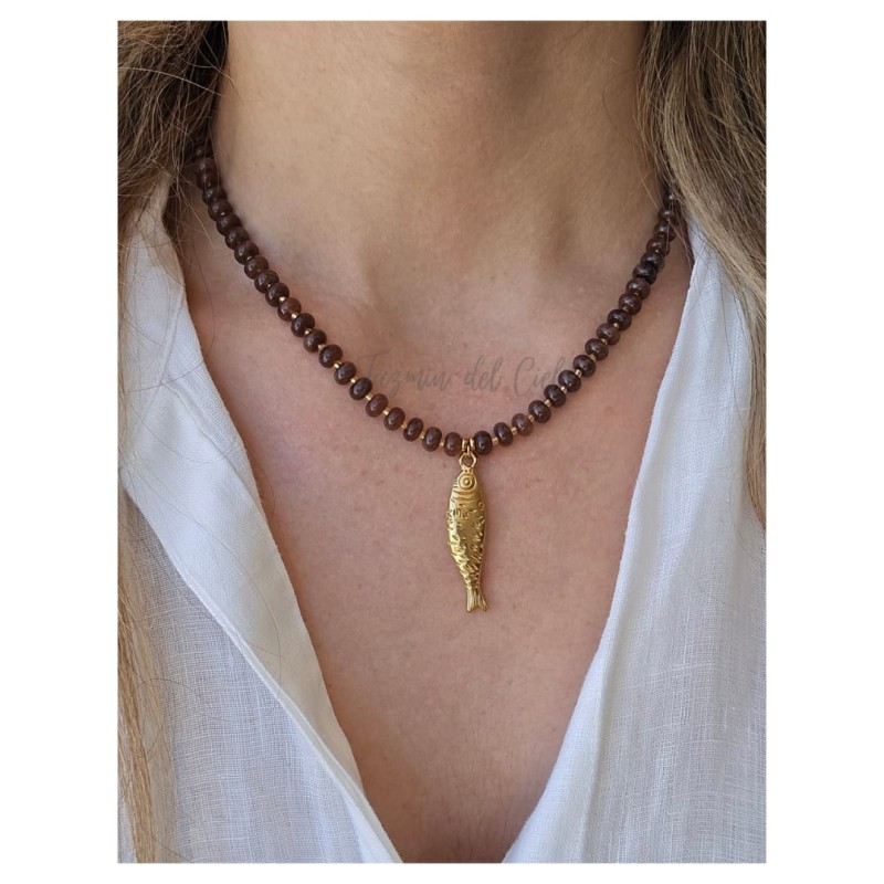Collar en piedras naturales Rondelle en ágata marrón con separadores en mostacillitas doradas con un dije central en forma de pez en acero inoxidable.