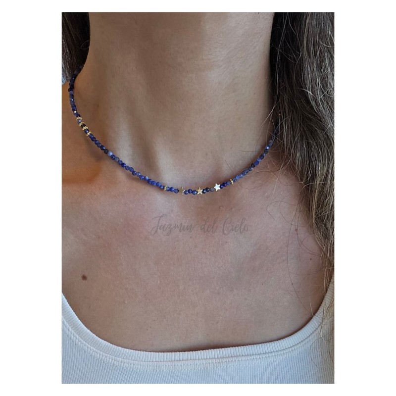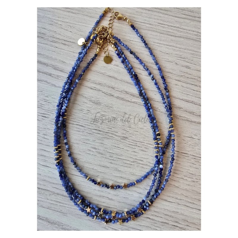 Collar en piedras naturales de Sodalitas con separadores dorados en acero inoxidable en forma de florcitas y 3 estrellas centrales en acero inoxidable.