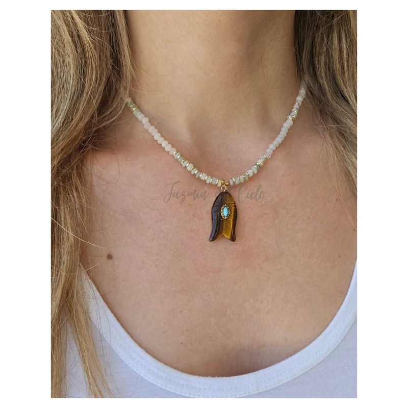 Collar en piedras naturales de agatas combinadas con piedras naturales amazonitas y separadores en Goldfield dorado y un dije central en forma de pez en piedra natural en ojo de tigre.