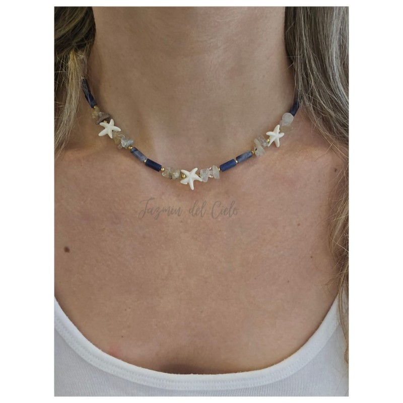 Collar en distintas piedras naturales en Sodalita y Fluorita, combinando texturas y formas con separadores dorados en acero inoxidable y estrellas de Mar natural, haciendo así un collar veraniego.