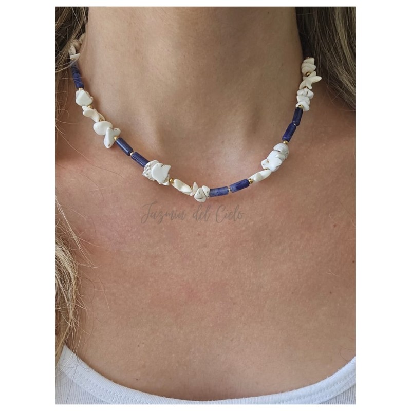Collar en distintas piedras naturales en Sodalita y Turquesa blanca, combinando texturas y formas con separadores dorados en acero inoxidable y estrellas de Mar natural, haciendo así un collar veraniego.