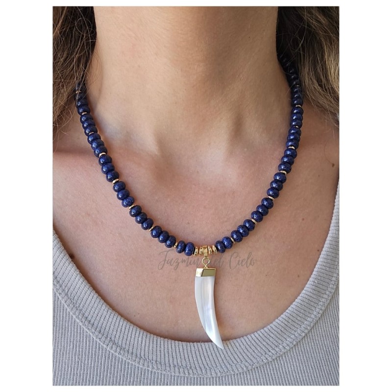 Collar en piedras naturales Rondelle de Jaspe azul con separadores dorados en acero inoxidable y un dije central en forma de diente en nácar.