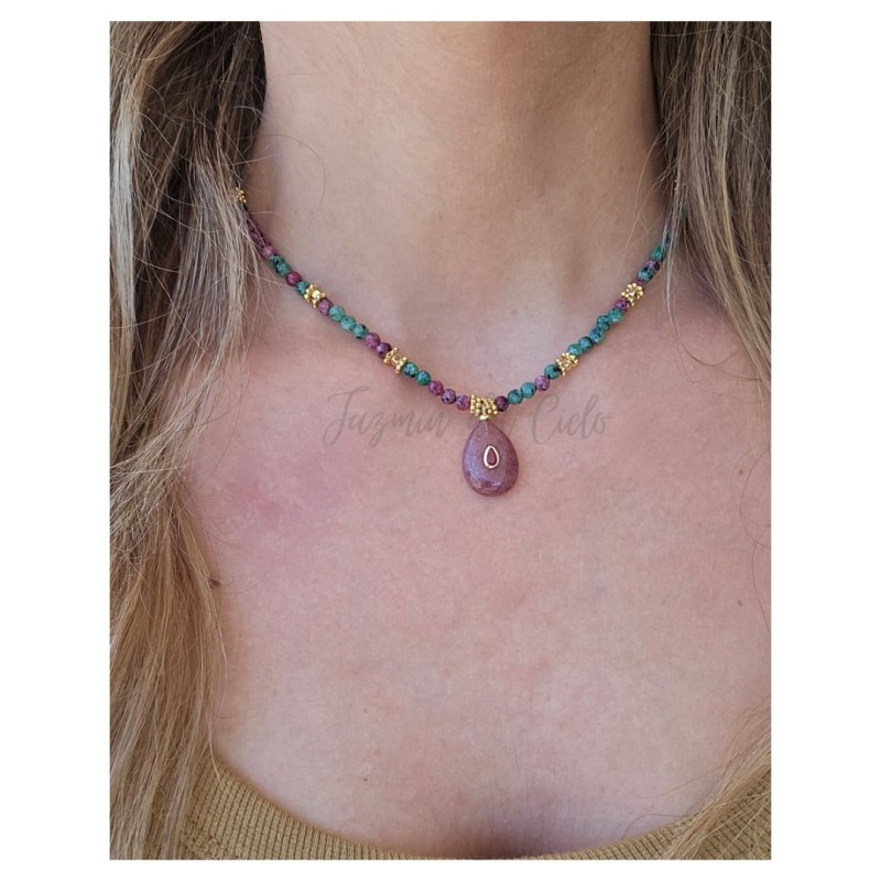 Collar en piedras naturales facetadas de Ruby Esmeralda con separadores en acero inoxidable y Goldfield color dorado y un dije central en forma de gota en piedra natural con circonita al tono.