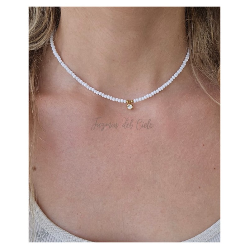 Collar en cristales facetados pequeños con un dije central de punto de luz .