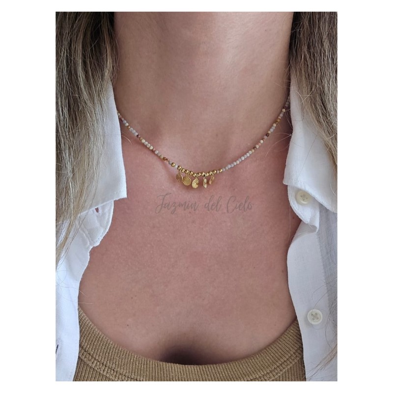 Collar en micro piedras naturales tonos tierra de Jaspe con separadores centrales y mini dijes redondos en acero inoxidable dorados.