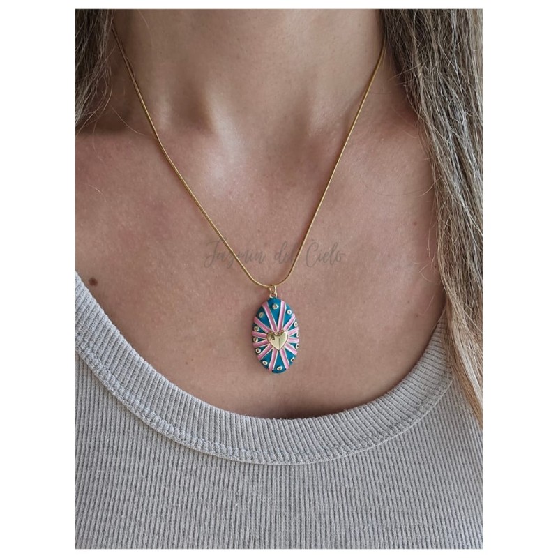 Collar en cadena cola de rata de acero inoxidable con un dije grande en forma ovalada de acero inoxidable y esmaltado azul con un corazón dorado central.