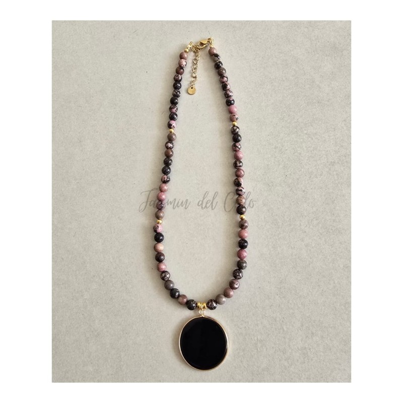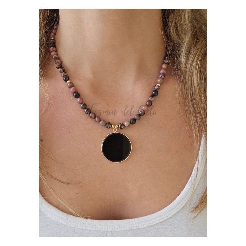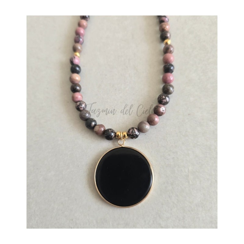 Collar de piedras varias (Rodonita, Agata y Cuarzo rutilado) con separadores de acero inoxidable y dijes de Obsidiana de forma circular.