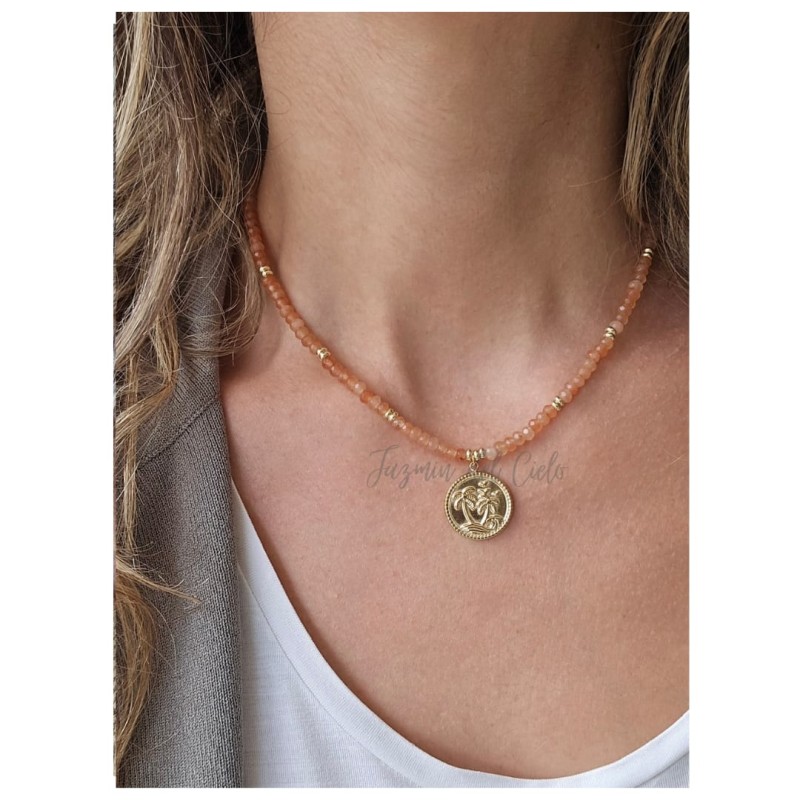 Collar en piedras naturales de Calcedonia color naranja con separadores dorados en Goldfield y un dije central redondo con diseño interior de palmeras dorado en acero inoxidable.