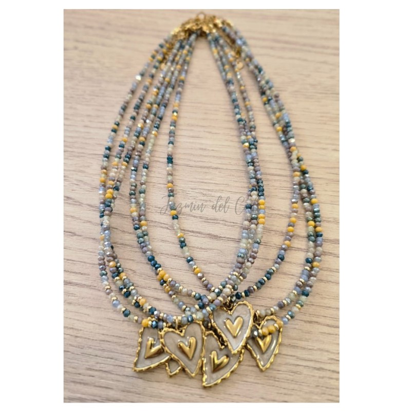 Collar en cristales facetados pequeños combinados con separadores dorados en Goldfield con un dije central en forma de corazón en acero inoxidable y esmaltado natural.